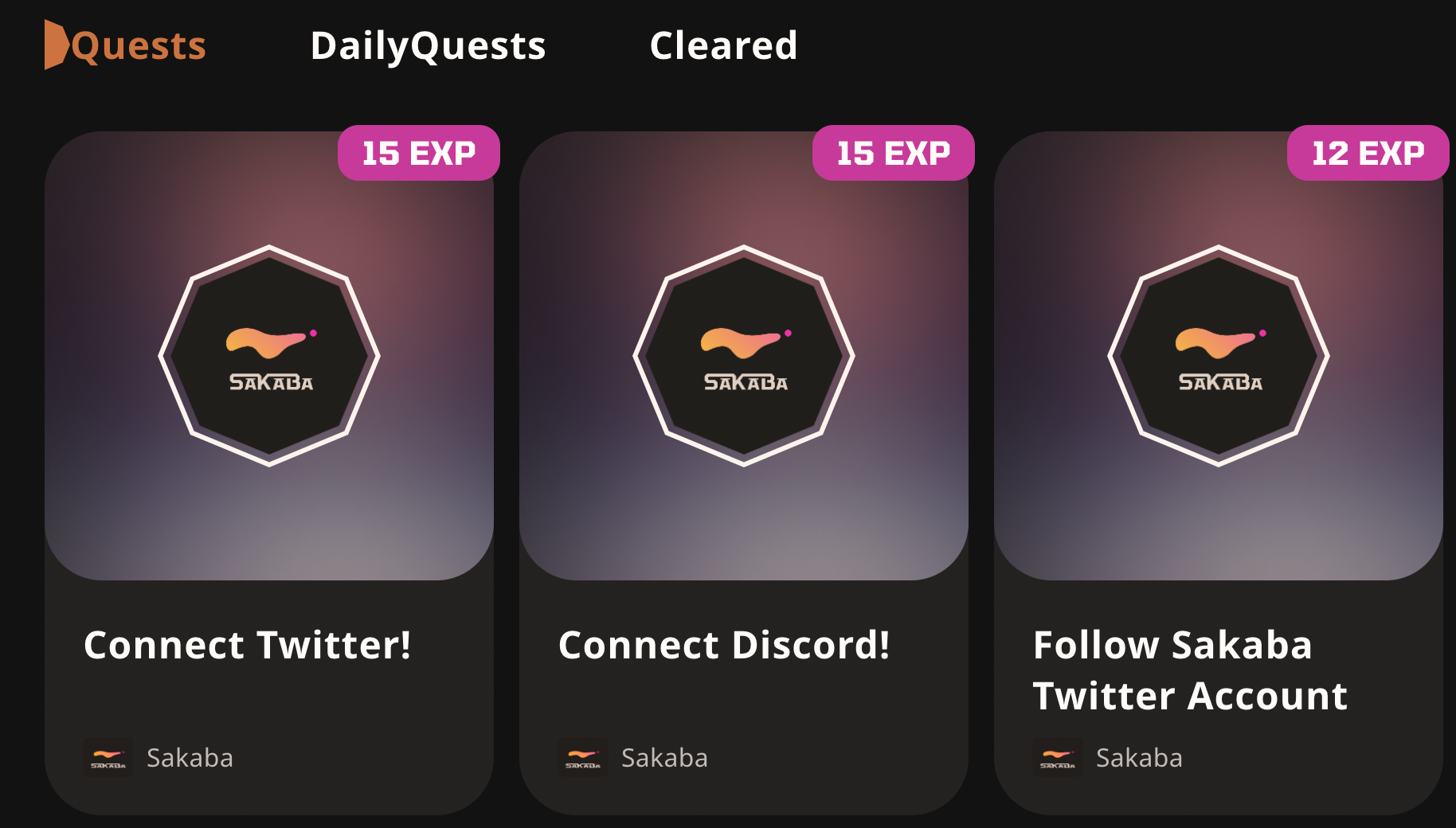Quest is one of the most crucial features in SAKABA which incentivizes gamers’ on and off-chain engagement through completion of specific objectives or tasks to gain rewards such as experience points, in-game items and currency.